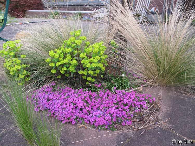 Bildname: Euphorbia mit Polsterphlox und Stipa tenuissima