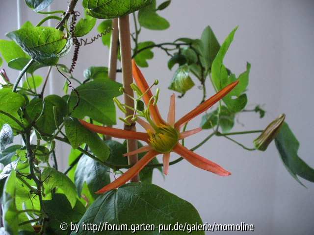 'Livie' ist ein noch recht neue Hybride,die auch super blüht...heute sind 4 Blüten auf.Im Gegensatz zu den meisten Passiflora bleibt ihre Blüte mehrere Tage geöffnet.