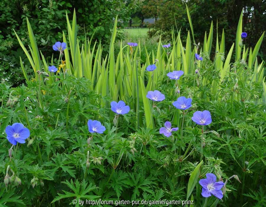Bildname: Geranium Brookside mit Iris pseudoacorus Variegata