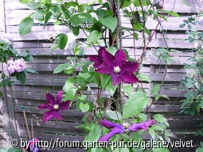 Bildname: Clematis Warszawska Nike mit Rose Comtesse de Murinais