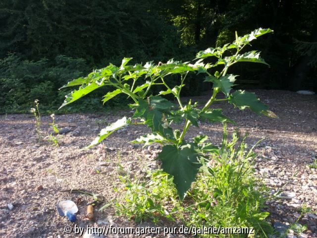 ... so ein prächtiger Bursche! Datura stramonium am 28.Juli 2014, Minuten bevor ich ihn vorsichtig ausgrub und entfernte! Das gab jetzt ein bisschen ein Loch! Und dennoch habe ich vielleicht nicht die ganze Wurzel erwischt... mal sehen ob er wiederkommt. Neiiiiiiin, nicht auf den Kompost! In Plastiktüte verpackt, verschnürt und und in den Müll.