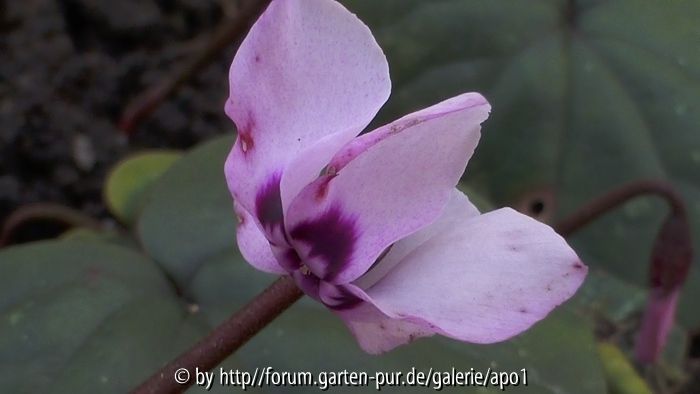 Bildname: Einzelblüte vom Vorfrühlings-Alpenveilchen (Cyclamen coum, syn. C. orbiculatum)