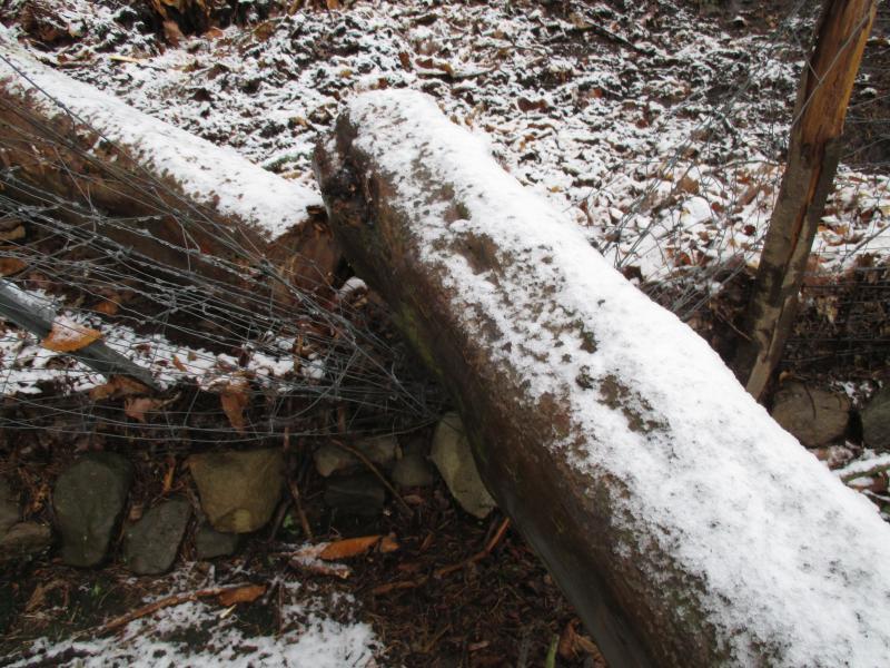 Bildname: eine abgestorbene Kiefer ist in den Wildzaun gestüzt