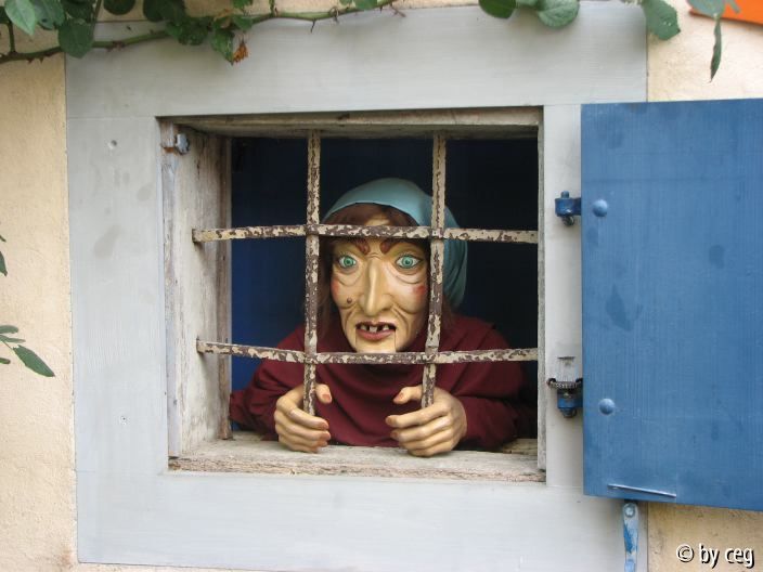 Die Hexe wohnt im blauen Haus. Für 50 Cent schaut sieh heraus.
