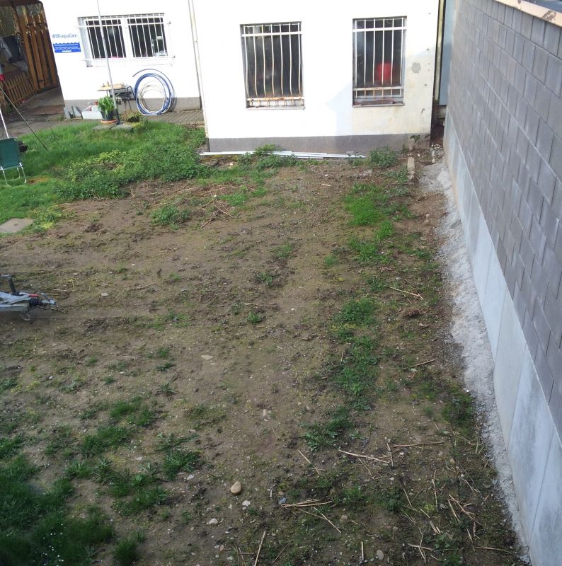 So sieht unsere Wiese aus, nachdem sie von einem kleinen Bagger und einem schwer beladenden Radlader bei Matschwetter befahren wurde. Leider haben wir schweren Lehmboden, und nun bei jedem Regen Tümpelbildung... Langsam wächst Stoppelweise die Wiese wieder durch. Wie man rechts sehen kann, wurde bei den Beton-L-Elementen gespart und aus diesem Grund mit Beton unterfüttert. Die Mauer ist Sache unserer Nachbarin.