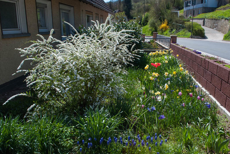 Bildname: Brautspiere und Narzissen im Vorgarten