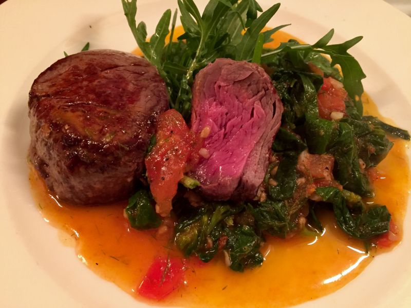 black angus-filet mit köstlichstem gartenspinat: junger knoblauch in butterfett mit meersalz gebräunt, mit gewürfelten tomaten und einem schuß weißwein eingekocht, frischer blattspinat dazu, unterheben, nach dem zusammenfallen gehacktes fenchelgrün und gehackte zitronenschale dazu, vom feuer, frisch pfeffern