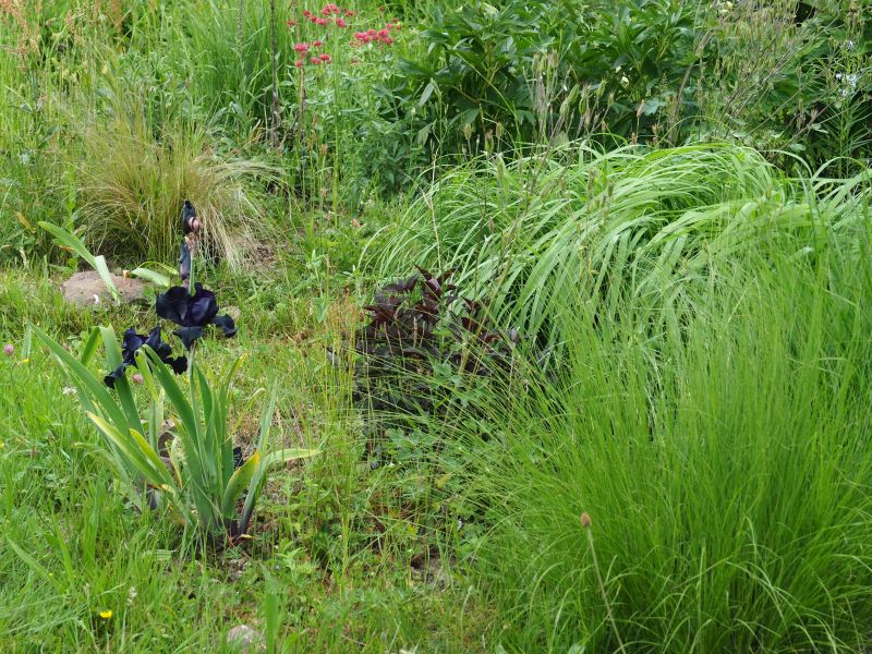 Bildname: Iris TB 'Black Dragon', Molinia, Eragrostis
