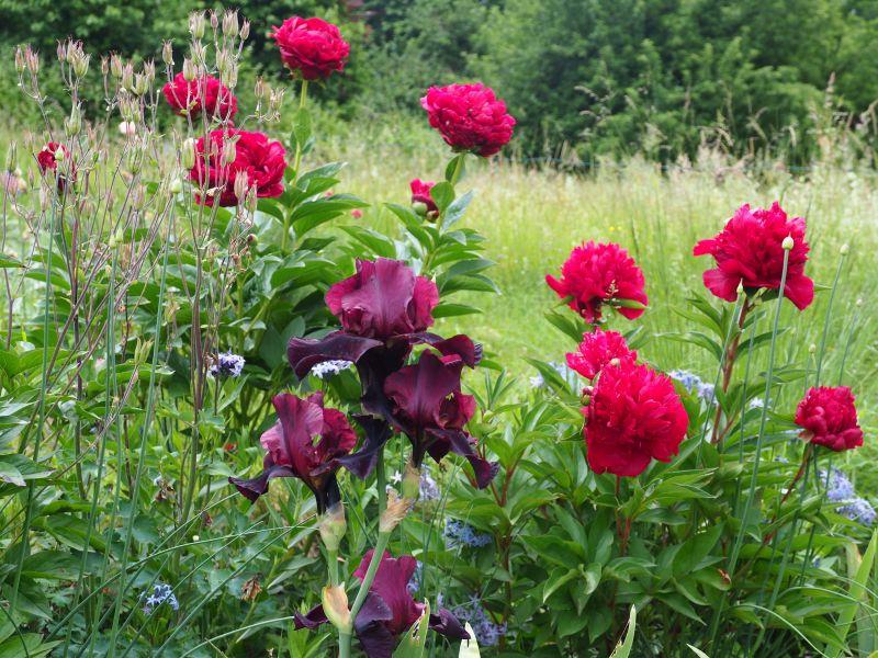 Bildname: Iris TB 'Spectaclar Bid' + Paeonia 'Old Faithfull' + 'Jessie'