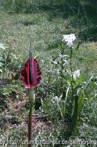 Bildname: Drachenwurz, im Hintergrund eine Freilandgloxinie