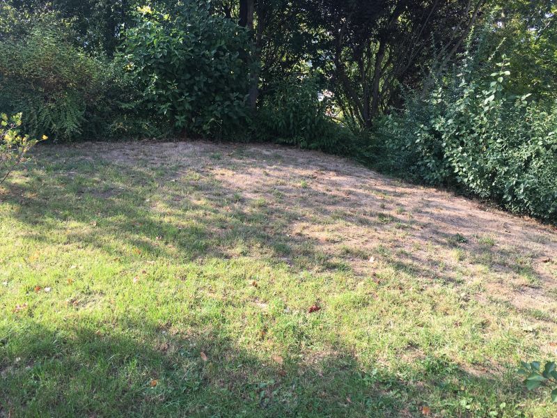 Rasen hinter dem Haus, viele "löchrige" Stellen und vor allem hier total verbrannt