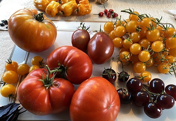 Bolivianische Obsttomate, Glossy Rose Blue, Mrs.Houseworth, Sunviva, TN Surprise, Ukrainian Purple