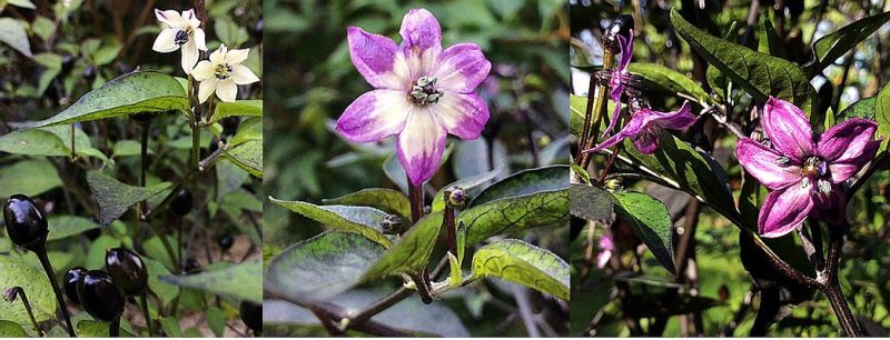 Bildname: Chili Blüten: "Birds Eye Tepin" (green), (purple), 'Peruvian Purple'