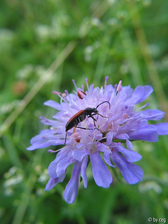 Bildname: Kleiner Bockkäfer auf einer Wald-Witwenblume (Knautia silvatica)