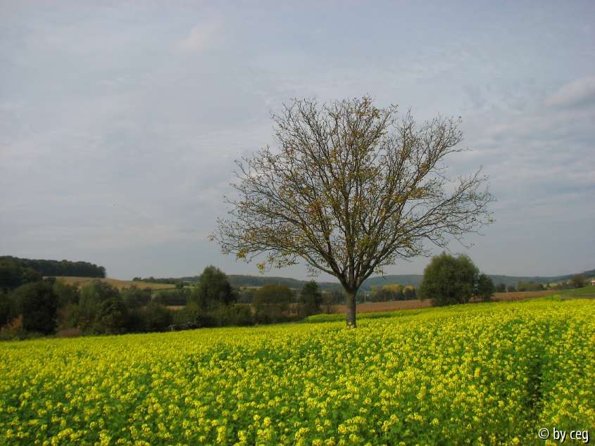 Bildname: Walnußbaum in einem blühenden Rapsfeld