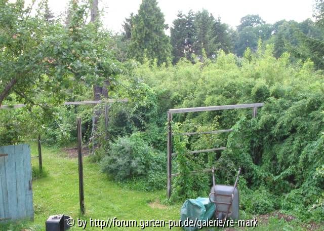 Die Kiwis sind durchaus erwünscht und werden in Zukunft wahrscheinlich auf noch zu errichtende waagerechte Erweiterungen der Pergola-Ansätze geleitet. Was wirklich Probleme macht sind die Winden... weil dieser Garten rel. weit entfernt von uns liegt ist er manchmal einige Wochen sich selbst überlassen. Auch aufgrund des feuchten und humosen Bodens genügen den Winden im Sommer wenige Wochen, um andere Sträucher vollkommen zu überwachsen. Dem Bambus können sie zwar nicht schaden, aber sie durchsetzen ihn und ziehen etliche überhängende Triebe vollkommen noch viel weiter nach unten.