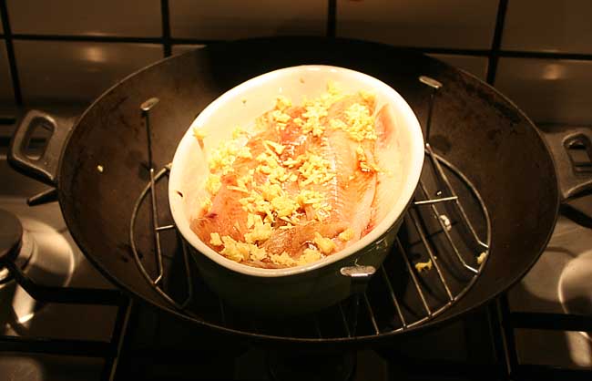 Bildname: gedämpfter ingwerfisch mit pinienkernen