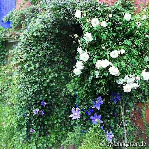 Bildname: schneewittchen und clematis am hauseingang