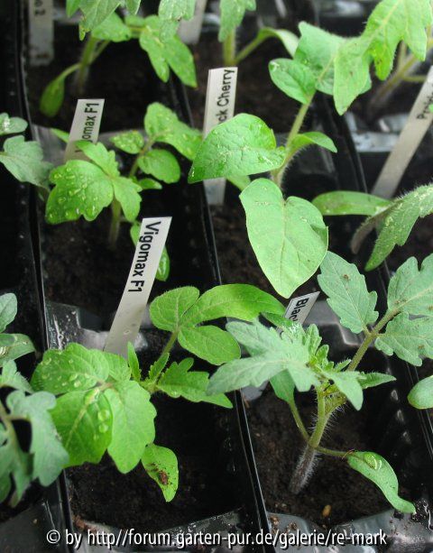 Die beiden Pflanzen rechts sollen beide 'Black Cherry' sein, aber während die untere normal aussieht, hat die obere 'Kartoffelblätter'.