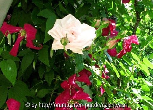 Bildname: Clematis Mme Julia Correvon mit Rosa New Dawn