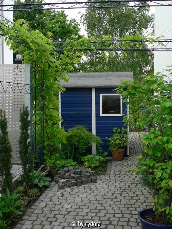 mit Stellplatz, Gartenhäuschen (noch sieht man das häßliche Dach, aber von der anderen Seite kommt schon Clematis montana Grandiflora!) und Gang in den Garten