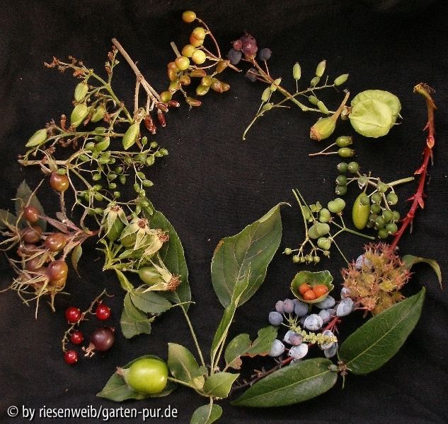 featuring, im uhrzeigersinn, von oben: amelanchier ovalis, berberis vulgaris, calycanthus floridus, staphylea pinnata, crataegus monogyna, cornus sericea, - sanguinea, - mas, euonymus europaeus, - alatus, - fortunei, kolkwitzia amabilis, mahonia 'Charity' (grosse blaue), - aquifolium, darunter sozusagen OT lonicera henryi, malus 'John Downie', ribes rubrum, - nidigrolaria (vulgo ribisl bzw jostabeere), rosa glauca, - canina, syringa vulgaris (gross, grün), viburnum opulus (schon rot), - rhytodiphyllum.