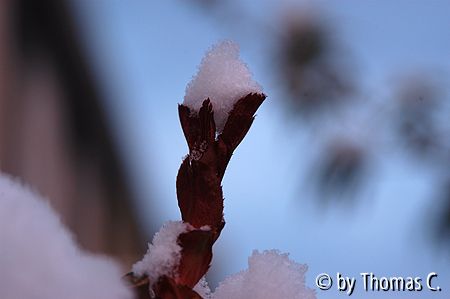 Bildname: Schneehäubchen in einem Rosentrieb