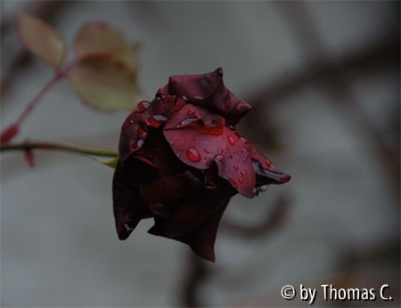 Bildname: Späte Francis Dubreuil-Blüte mit Tropfen