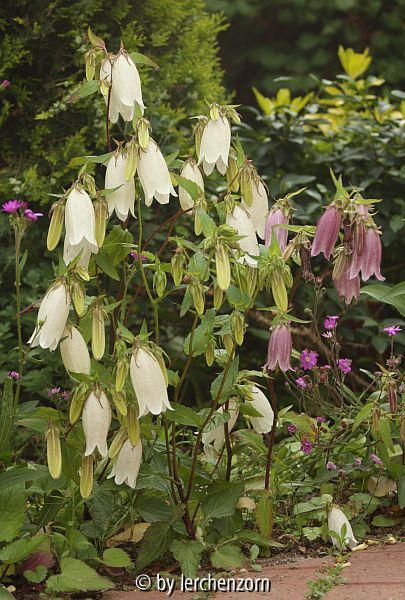 Bildname: Tüpfel-Glockenblume (Campanula punctata), "Alba" und ?"Hot Lips"