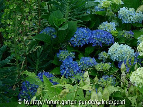 Bildname: Blaue Hortensie mit Mondviole und Wolfsmilch