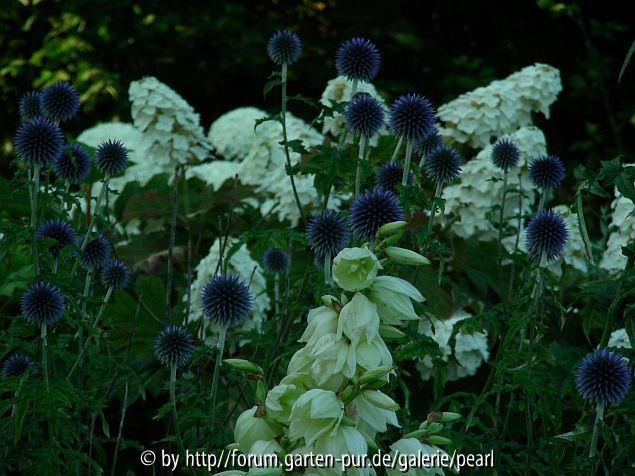 Bildname: Eichenblättrige Hortensie mit Kugeldisteln und Yucca