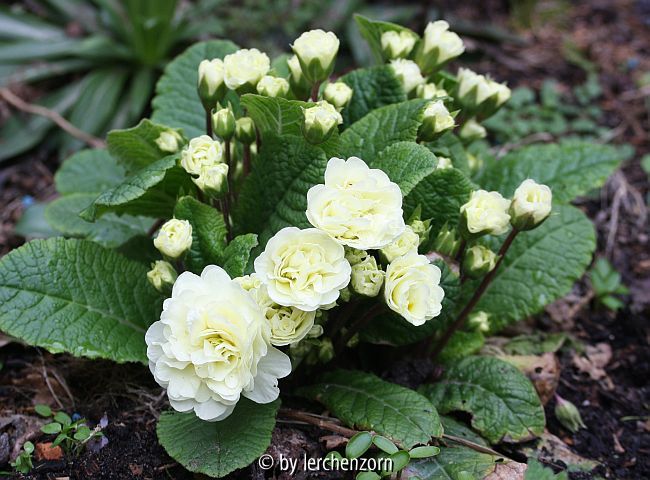 Bildname: Gefülltblühende Kissenprimel (Primula vulgaris, weiß-gefüllt)