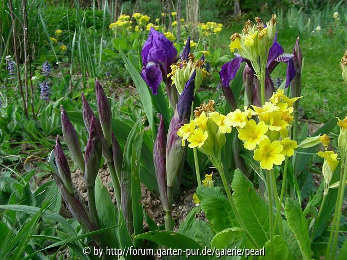Bildname: Iris aphylla mit Primula veris