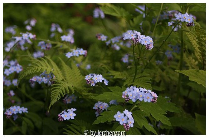 Bildname: Wald-Vergissmeinicht (Myosotis alpestris) mit Buchenfarn und Scheinmohn