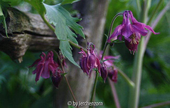 Bildname: Akelei (Aquilegia-vulgaris-Hybride), rot-lila, flache Krone
