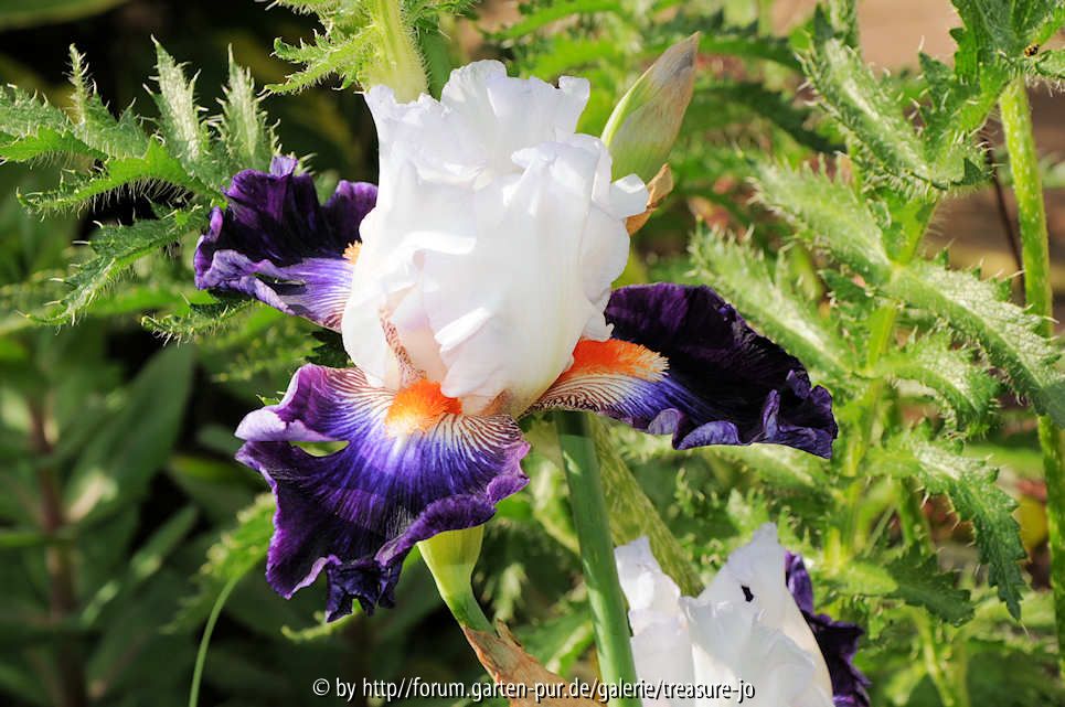 Bildname: Garteneinblick Juni Iris weißviolett