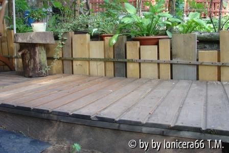 Zwischen Holzdeck und Palisadenwand einen 1cm Spalt lassen, damit Wasser ablaufen kann. Eine Leiste an die Palisaden schrauben, damit die Reihe gerade bleibt,bis sich alles gesetzt hat. Ebenfalls von der Rückseite mit einer Latte alle Elemente verbinden.