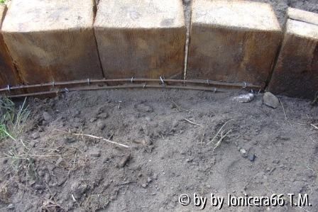 Palisade für die Treppenstufe, 50cm in den Boden eingelassen und untereinander mit Krampen und Schweißdraht verbunden.