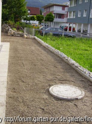 auf der westlichen grundtsückgrenze war ein höhenunterschied zum nachbar von ca. 40 cm zu bewältigen; es wurden 2 reihen betonkammersteine in einen fundamentstreifen betoniert und mit beton gefüllt wegen der stabilität; damit man obenauf nicht den häßlichen beton der füllung sieht, wurde dieser nur bis ca. 5 cm unter den rand aufgefüllt und die kammern mit bachsteinen vollgefüllt.