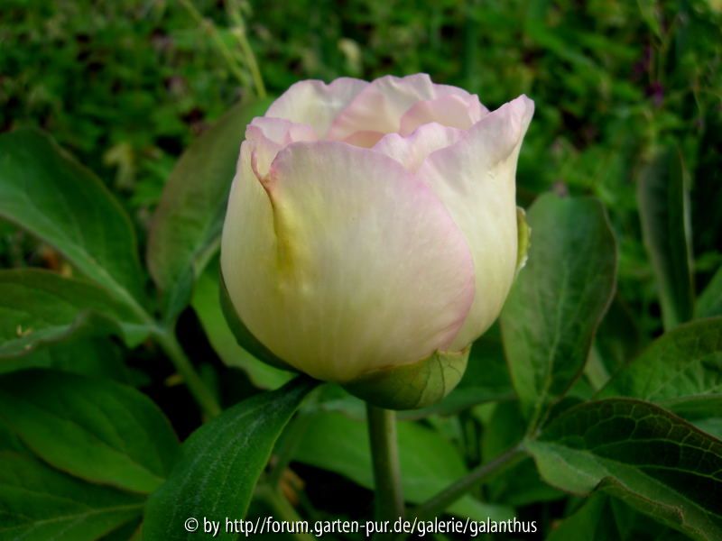 Bildname: Paeonia officinalis weißer Sämling im Aufblühen