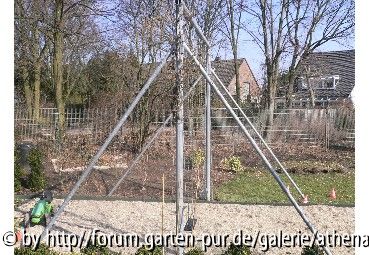 Das Schaukelgestell von der erhöhten Terasse aus gesehen. Im oberen Bereich noch die Reste vom Vorjahres-Bewuchs....