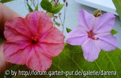 Bildname: Mirabilis jalapa und longiflora-Hybrid im Vergleich (links Papa, rechts Kind)
