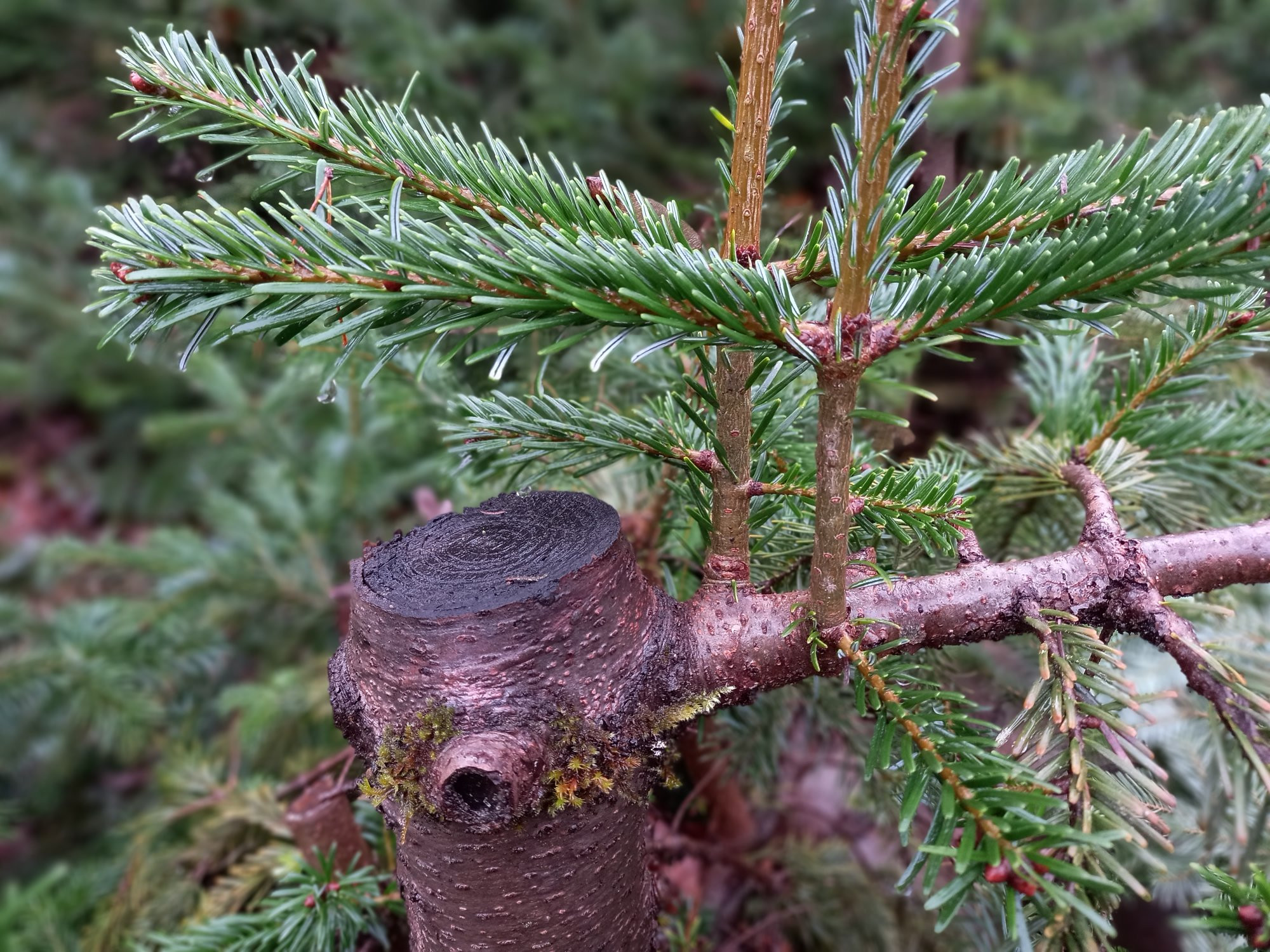 Wenn Tannen zu hoch werden kann man sie auf den Stock setzen. Wenn dabei ein oder zwei Astringe stehen bleiben, treiben sie aus schlafenden Augen am Stamm wieder aus.