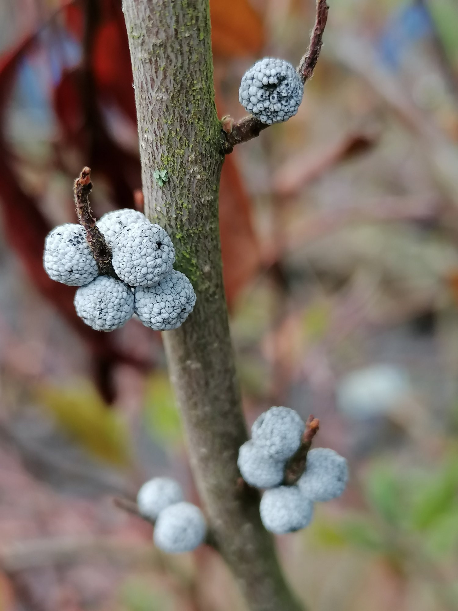 Ich freue mich derzeit über die schöne Herbstfärbung unseres Kugelamberbaums, Liquidamber styraciflua Gumball. Der normale, aufrecht wachsende ist schon lange kahl.