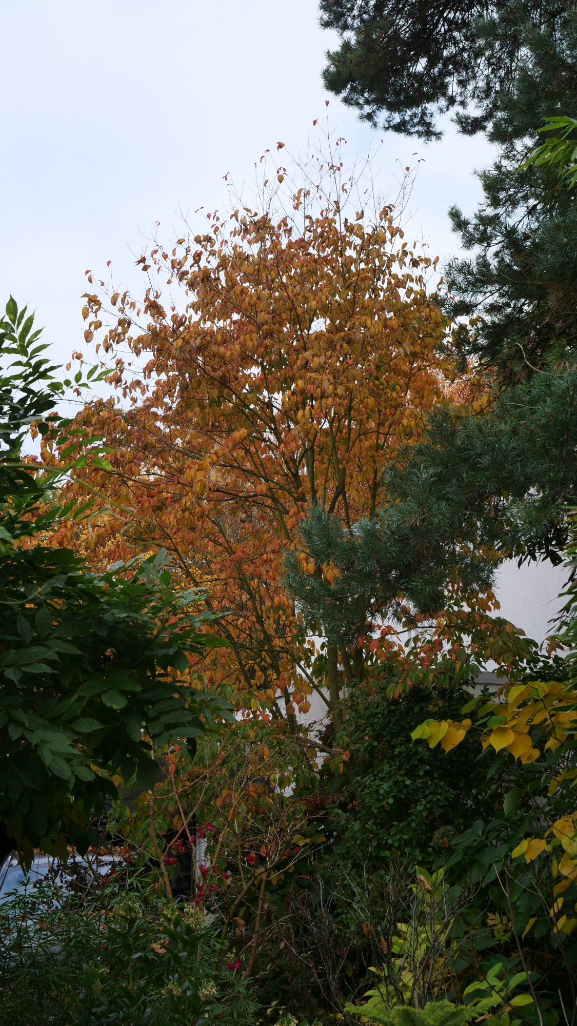 Die Tage mit der intensivsten Herbstfärbung habe ich leider verpasst, doch auch heute noch zeigt Cornus 'Stellar Pink' was er kann.