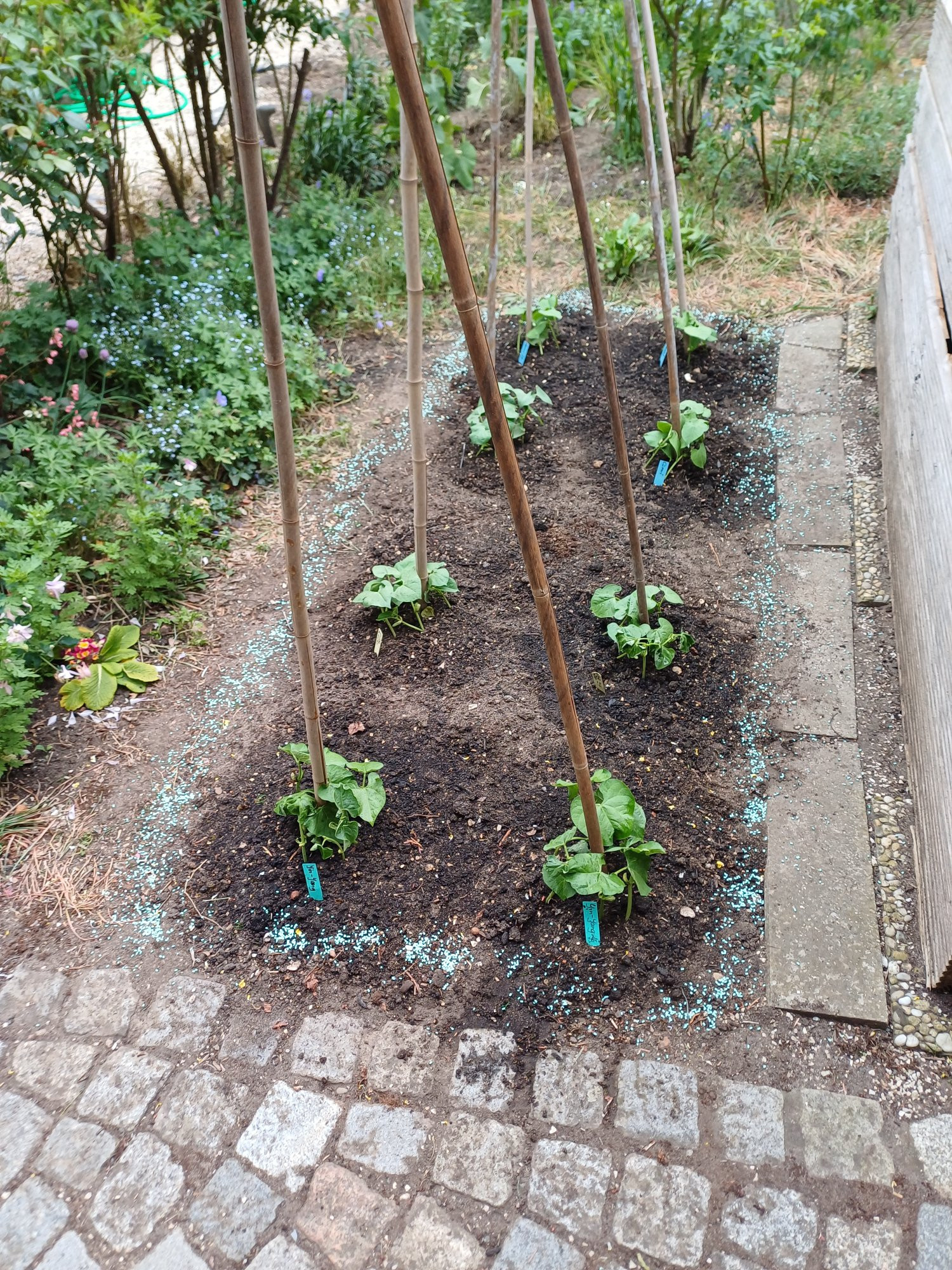 Hier wurden heute auch die Stangenbohnen ausgepflanzt . Das ist nur ein Teil, ich hatte zuviele vorgekeimt und musste noch weitere Bohnenstangen aufstellen