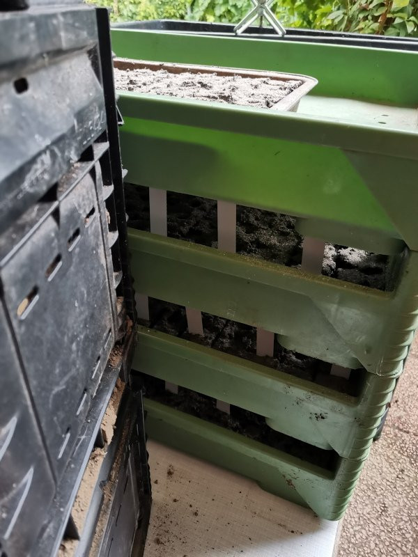 Jetzt stehen sie gestapelt bis sie keimen, dann müssen sie auseinandergestellt werden. Heute knapp 20°C, morgen ähnlich, die 3 Tage kühl reichen, bis dahin ist die Keimung abgeschlossen. Ich rechne bei den Temperaturen nach 5-6 Tagen mit den ersten Keimblättern.