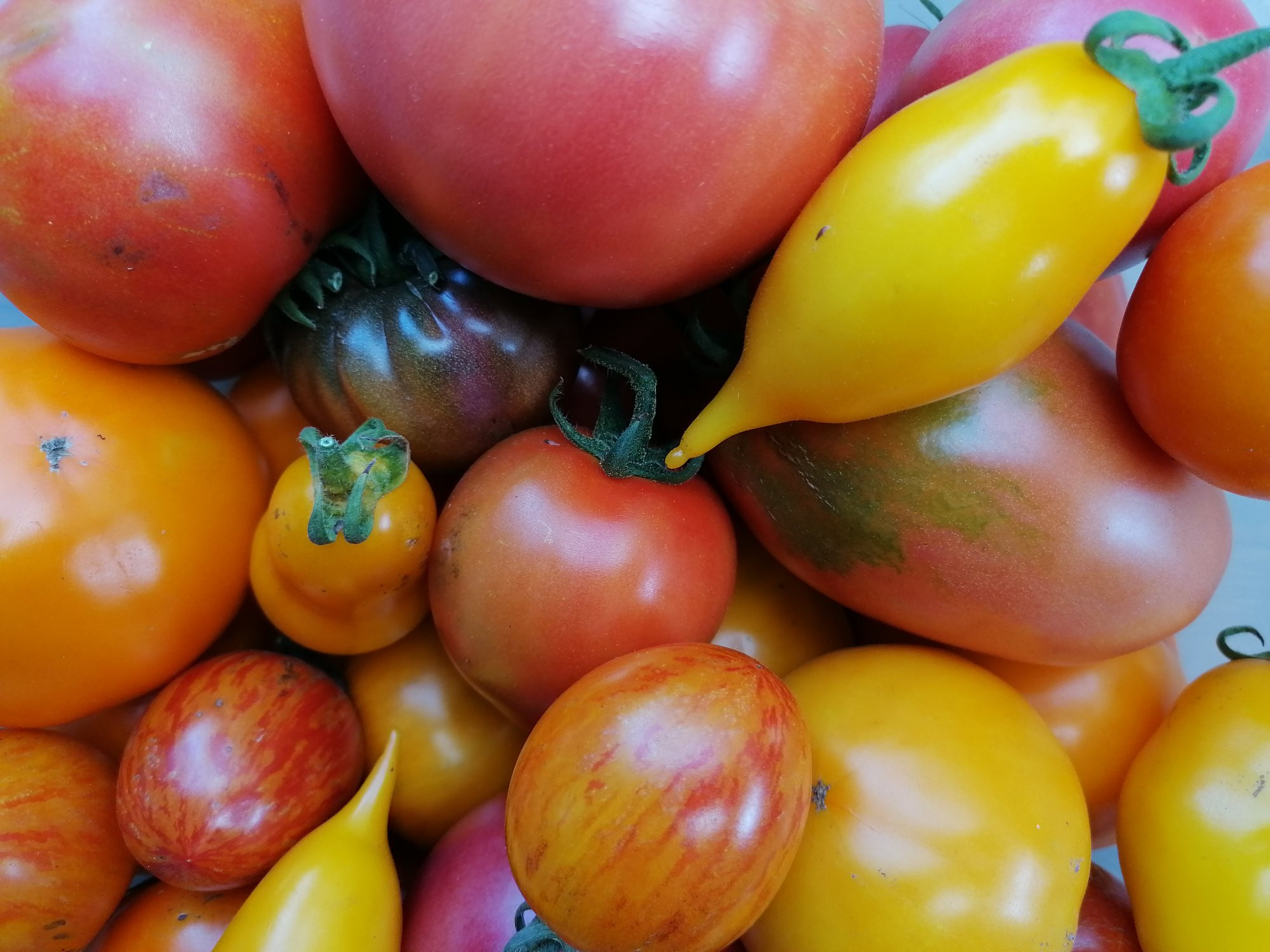 Richtig gut ist übrigens die 'Honey Moon F1', auch wenn es mir schwerfällt, das zu sagen. In der Schüssel oben mittig. Richtig rosa Fleischtomate halt, zartes Fleisch, süss,etwas fester als die Sorten aus Kasachstan etc.