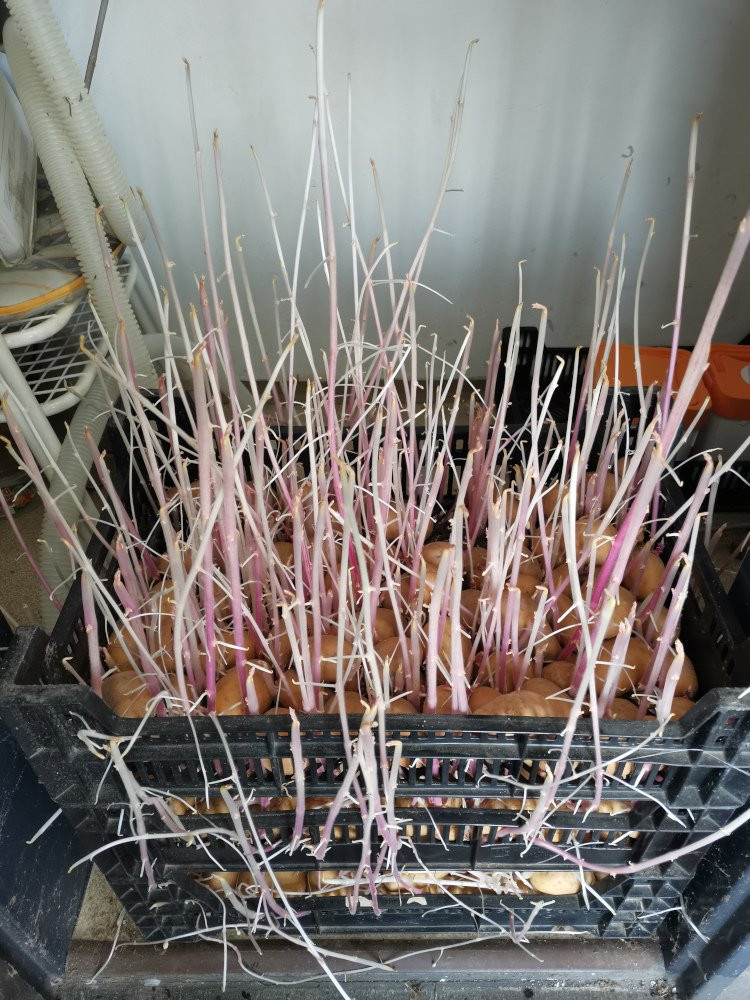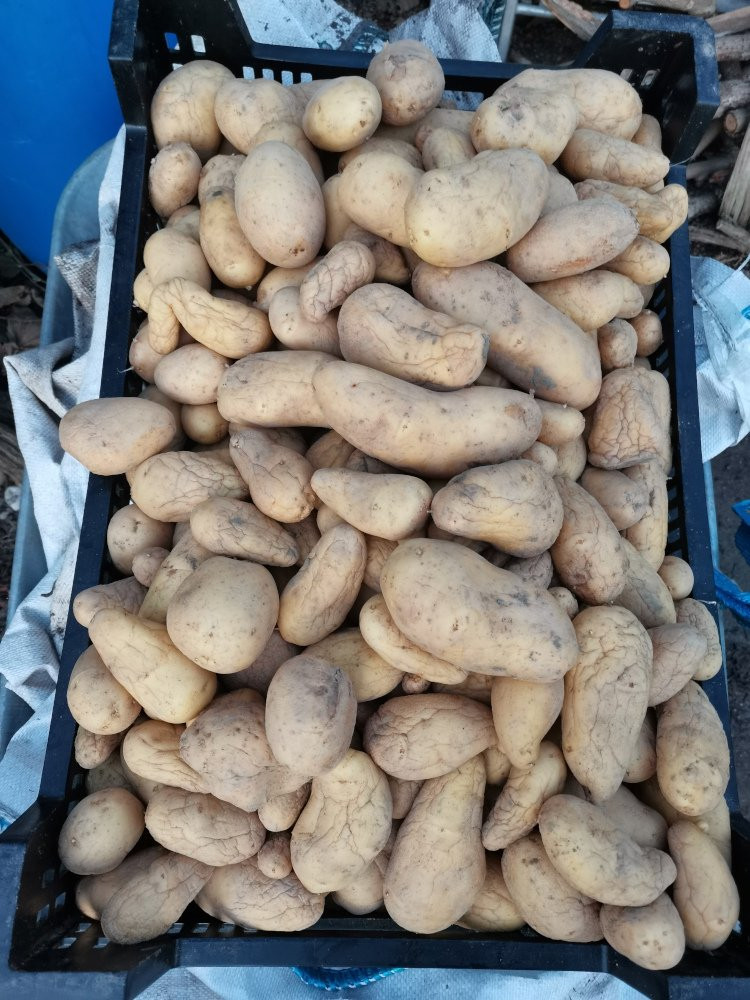 Die Kiste ganz unten ist die Kiste obendrüber, nur erst kurz vor Sonnenuntergang fotografiert, deshalb andere Farbe. Man sieht auch schön an der Knollenform, dass es Annabelle sind. In die Kiste hatten sich 5 Simonetta geschmuggelt, da hatte einer bei der Ernte geschludert, ist sofort aufgefallen.