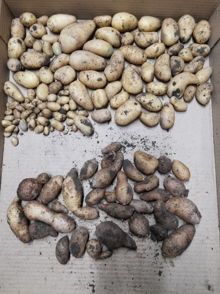 Jedenfalls sieht man schön, was Lagerfähig ist und was nicht. Ich habe noch einen Kübel mit Annabelle, der wurde nicht geerntet, ist wieder durchgetrieben, neuer Knollenansatz, der wird jetzt demnächst geerntet. Vielleicht hat der das Potential, Annabelle an Weihnachten zu liefern, die noch nicht wieder keimen. Wäre vielleicht auch was für die Pflanzkartoffeln nächstes Jahr, allerdings waren da zwischenzeitlich mal die Wanzen dran, daher keine Ahnung was die Viruslast angeht.